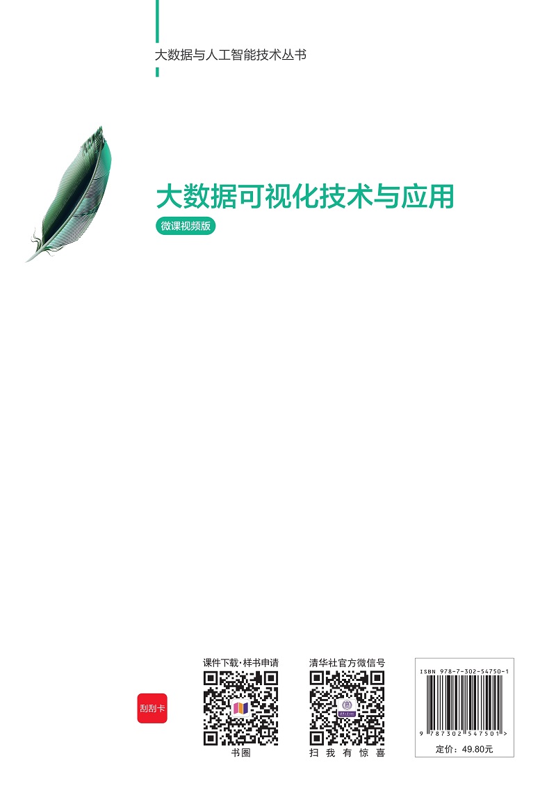 前言 大数据是现代社会高科技发展的产物,相对于传统的数据分析,大数据是海量数据的集合,它以采集、整理、存储、挖掘、共享、分析、应用、清洗、可视化为核心,正广泛地应用在军事、金融、环境保护、通信等各个行业中。 数据可视化是关于数据视觉表现形式的技术,也是科学、设计和艺术3个学科的交叉领域, 对于大数据专业的学生来讲,数据可视化是极其重要的一门课程。 本书以理论与实践操作相结合的方式深入讲解大数据分析的基本知识和实现的基本技术,在内容设计上既有上课时老师的讲述部分,包括详细的理论与典型的案例,又有大量的实训环节,双管齐下,极大地激发了学生在课堂上的学习积极性与主动创造性,让学生在课堂上跟上老师的思维,从而学到更多有用的知识和技能。 本书内容共10章,分别为大数据可视化概述、大数据可视化原理、大数据可视化方法、数据可视化工具、Excel数据可视化、Tableau数据可视化、ECharts与pyecharts数据可视化、Python数据可视化、大数据可视化行业分析以及大数据可视化综合实训。 本书的特色如下: (1) 采用“理实一体化”教学方式,既有课堂上老师的讲述,又有学生独立思考、上机操作的内容。 (2) 对大数据的可视化实现采用了多种方式,既有开源工具的可视化实现,又有大数据下的可视化编程语言实现。 (3) 编写本书的作者都具有多年的教学经验,全书重难点突出,能够激发学生的学习热情。 (4) 重点内容及重点案例配有微课,学生可在课后反复观看。 注: 本书提供教学大纲、教学课件、电子教案、习题答案、程序源码、教学进度表等配套资源, 扫描封底...
