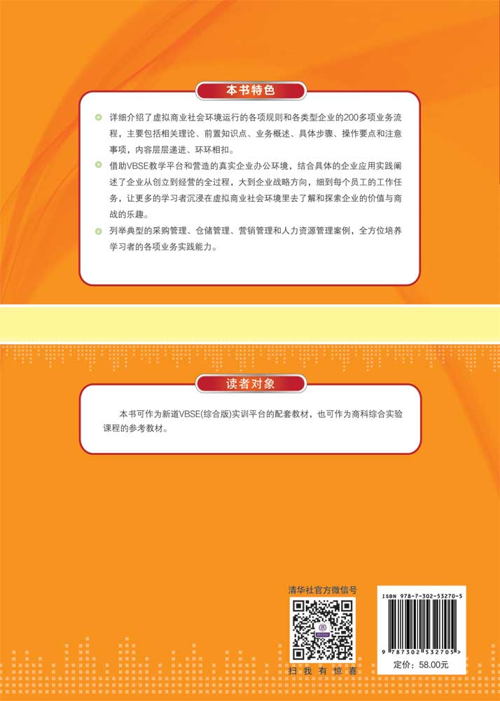 借助VBSE教学平台和营造的真实企业办公环境,结合具体的企业应用实践阐述了企业从创立到经营的全过程,大到企业战略方向,细到每个员工的工作任务,让更多的学习者沉浸在虚拟商业社会环境里去了解和探索企业的价值与商战的乐趣。