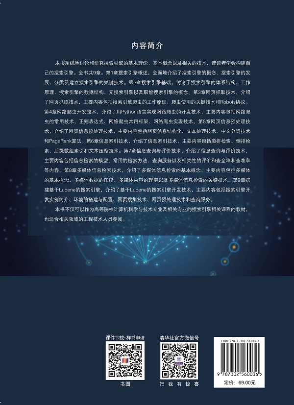本书从教学的角度出发,全面地阐述了搜索引擎的原理和实践,包括:搜索引擎的基本原理与技术、搜索引擎的数据结构和搜索引擎的爬虫、信息处理技术、信息检索技术、信息检索评价技术、多媒体信息检索技术以及搜索引擎开发技术。 在教材的编写过程中,对基本概念、基础知识的介绍力求做到简明扼要;各章相互配合,又自成体系附有小结和习题,同时还有相关的实验及应用技术。 本书适合高等院校计算机科学与技术专业及相关专业的高年级学生和研究生阅读参考,也适合相关领域的工程技术人员参阅。