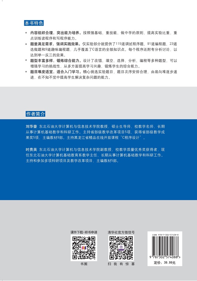 前言 本书是与刘华蓥教授等编写的《C程序设计教程(第3版)》(主教材)配套的实验指导书与习题集,其中的内容和章节的编排顺序与主教材一致。 根据中国高等学校计算机基础教育课程体系(CFC2014)的要求,本着提高学生计算机应用能力和注重实践教学的精神,书中实验指导部分占据较大的比重,大幅度压缩了习题部分的篇幅。实验指导部分配有大量的分析讨论问题,希望学生在解决每个问题时能够举一反三,收获更多。在前几个实验中设计了很多程序改错题,以使学生注意初学编程时各种易犯错误。实验指导部分无论是改错、填空还是编程题,都没有给出答案,一方面可以通过上机来完成,另一方面也可以给学生更多思考的空间。有些实验还提供了趣味编程题和有一定难度的选做题,可以让学生体验到编程的乐趣和挑战。全书共设计了20个实验,其中所有程序都在Microsoft Visual C++ 6.0环境下调试通过。实验20简单介绍了在Windows 7、Windows 10上都能使用的DevC++编译环境,以及全国计算机等级考试二级C语言程序设计使用的Visual C++ 2010编译环境。本书习题集部分的所有习题都给出了参考答案。 本书大幅度增加了实验的题量,大量增加了常用算法的实验,希望学生通过实验能够更好地掌握课堂所学内容。在实验部分,本书覆盖面比较广,以满足不同学生的学习要求以及教师的实验安排。程序题按照先易后难的原则,首先给出程序,让学生在上机练习的过程中发现题中的错误,或者根据分析讨论中的提示进行完善和补充,以使读者掌握程序设计思路的多样性、程序设计方法的灵活性,同时避免以往学生常犯的错误。 本书涉及的题量比较...