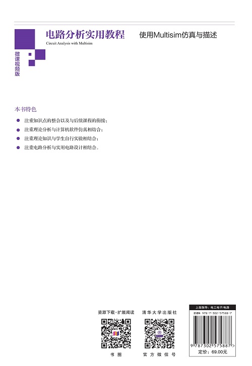 前言 “电路分析”是普通高等院校电类专业的一门重要的专业技术基础课,它的任务是在给定电路模型的情况下,通过求解电路中各部分的电压和电流来了解其特性。作者在多年教学实践中发现,通过这门课,学生除了应掌握电路的基本概念、基本规律、基本分析方法和定理等内容外,还应学会计算机软件仿真,以及树立电路设计思想,这样更有利于本课程的学习,有利于与后续专业课程的衔接,有利于满足行业对专业人才的知识要求。 电路理论应该与实践紧密结合,二者相辅相成。本书每一章均在讲述“电路分析”理论的基础上,介绍了与之相关的仿真实验,利用Multisim本书采用的仿真软件为Multisim英文版,书中仿真图中的文字为英文,元器件符号为美国标准符号。仿真软件对所学内容进行分析和设计验证。每一章的习题均分为分析题和设计题,旨在能够更好地培养学生认识、分析和设计电路的能力。 视频1 扫码观看 我们在教学中深刻体会到,学生往往只是分析一个给定的电路,而对设计一个电路却无从下手,哪怕是最简单的一个电阻分压电路、一个RLC谐振电路。为此,本书在每一章中特意编写了实际电路设计方面的题目,使读者在这方面有所涉及,以便为以后的课程学习和实践打下基础。 本书从内容上可分为三个部分。第1~7章介绍电路的稳态分析方法,包括直流电阻电路分析和正弦交流电路分析,直流分析是交流分析的基础,而稳态分析是本课程的核心内容。第8章介绍电路的动态分析,通过本章,读者可以学习动态分析的方法,掌握一些结论性的知识点。为了与后续课程知识衔接,还需要学习第9章二端口网络和第10章非线性电阻电路分析,前者包含有模...