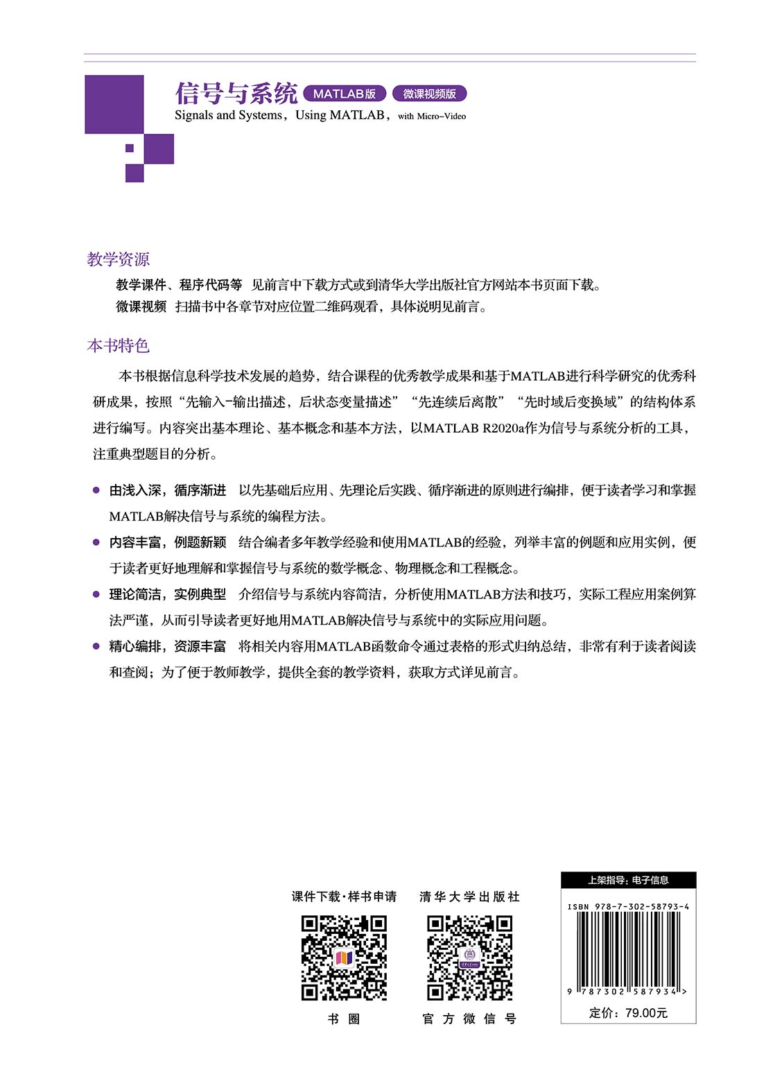 《信号与系统(MATLAB版?微课视频版)》以首批国家级一流本科课程“信号与系统”(宁夏大学)为蓝本,以适应我国高等教育全面开展新工科建设,加快推进教育现代化实施方案与高水平工科教育。本书主要讲述连续和离散信号的时域分析和变换域分析,线性时不变系统的描述和特性,连续信号和离散信号通过线性时不变系统的时域分析和变换域分析,以及系统的状态变量分析法。内容突出基本理论、基本概念和基本方法,结合课程的优秀教学成果和基于MATLAB进行科学研究的优秀科研成果,以MATLAB R2020a作为信号与系统分析的工具,给出了大量实例。 《信号与系统(MATLAB版?微课视频版)》既可作为电子信息工程、通信工程、自动化、信息工程、自动控制工程、电气工程及其自动化、测控技术与仪器、光信息科学与技术、计算机科学与技术等专业的本科教材,也可供其他专业选用和工程技术人员参考,同时可作为报考电子科学与技术、信息与通信工程、电气工程等学科硕士研究生的复习参考用书。