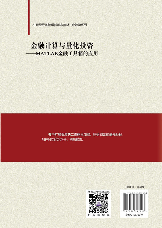 前言 随着大数据以及计算机科学技术的发展和金融计算与量化投资的火热,经济金融领域对数据分析的要求越来越高,MATLAB作为数据处理和科学计算的工具其应用也越来越多,编写一本以MATLAB为编程语言的适合入门的量化投资教材是有必要的。 国内出版的与金融计算与量化投资相关的MATLAB教材及参考书,对MATLAB相关基础知识和操作进行了详细的讲解,对于专业部分的金融计算和量化投资部分进行了深入的讲解。但对于经管类等编程基础较为薄弱的社科专业的本科生及研究生来说还是晦涩难懂、学习难度较大。而对于对量化投资感兴趣的其他专业学生来说,其中涉及的金融知识又比较陌生。 本书以上述问题和需求为出发点,使用较新的MATLAB R2020a为教材代码及实例编写工具,以金融数据为切入点,详细讲解了MATLAB的基础操作及编程方法。对金融数据相关的基础处理方法,例如数据的导入、导出及可视化方面进行了丰富的实例操作及讲解。在此基础上,本书还将金融数据统计分析方法和常用金融计量模型进行了实现及实例讲解,丰富了以MATLAB为工具的金融计量实证的范例,可供读者学习和运用。此外,本书还就经济、金融领域常用的风险管理方法,例如,VaR和CVaR等方法和实例进行了讲解。在最后一章,将金融数据处理中常用的机器学习和深度学习算法进行了实现,并对每个算法设计了一个金融数据处理的案例。本书的代码部分采用MATLAB实时编辑器完成,读者成功安装相应版本后,参考源代码可直接进行操作。 本书可以作为金融计算及量化投资学习、MATLAB及相关课程的教学参考书,适用于经济、金融和管理类等专业的本科生及研...