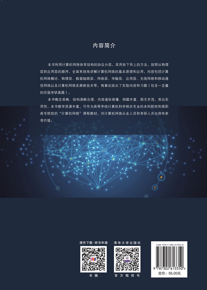 本书利用计算机网络体系结构的协议分层,采用自下而上的方法,按照从物理层到应用层的顺序,全面系统地讲解计算机网络的基本原理和应用,内容包括计算机网络概论、物理层、数据链路层、网络层、传输层、应用层、无线网络和移动通信网络以及计算机网络发展新技术等,每章还给出了实验内容和习题(包含一定量的历届考研真题)。 本书概念准确,结构清晰合理,内容通俗易懂,例题丰富,图文并茂,突出实用性。本书教学资源丰富,可作为高等学校计算机科学相关专业“计算机网络”课程的教材,对计算机网络从业人员和考研人员也很有参考价值。