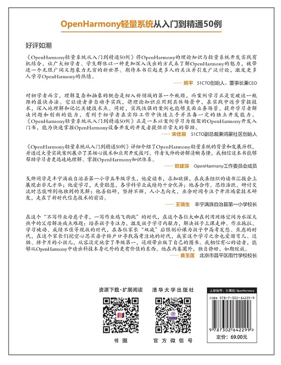 前言 OpenHarmony操作系统是由开放原子开源基金会(OpenAtom Foundation)孵化及运营的开源项目,是一款由全球开发者共建的开源分布式操作系统。其目标是面向全场景、全连接、全智能时代,基于开源的方式搭建一个智能终端设备操作系统的框架和平台,促进万物互联产业的繁荣发展。从推出之日至今,OpenHarmony操作系统的发展愈加迅速,生态系统建设愈加成熟,已经成为全球智能终端操作系统领域不可忽视的新生开源力量。 为了让更多的人了解并熟练使用OpenHarmony 轻量系统,笔者将自身学习经历以案例的形式进行了梳理、总结,形成了本书,供更多的爱好者参考、学习。 本书特点 本书从基础知识着手,通过大量的案例全方面系统地讲解OpenHarmony轻量系统开发,由表及里、深入浅出、循序渐进,集前瞻性、应用性、趣味性于一体。主要面向的读者是对OpenHarmony轻量系统应用开发感兴趣的学生、开发人员或者相关从业人员,让更多的人掌握OpenHarmony轻量系统应用开发技术。书中的案例基于海思Hi3861的开发板编写。 第1章OpenHarmony轻量系统开发基础,主要讲解OpenHarmony发展历程、环境搭建、应用模块工程创建与运行、应用模块启动流程解析等内容,为后续开发做准备。 第2章OpenHarmony轻量系统设备开发,通过25个案例详细讲解OpenHarmony轻量系统核心设备接口WatchDog、ADC、GPIO、PWM、I2C等开发技术。 第3章OpenHarmony轻量系统系统开发,通过6个案...