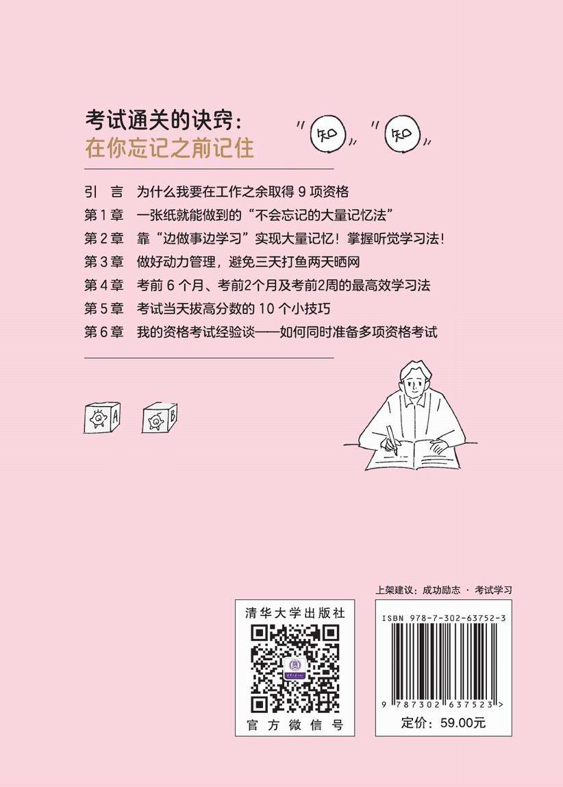 本书的核心内容在于作者独创的、可针对不同备考人群的、仅用一张纸、一支笔就能解决的“大量记忆表”以及问题本的使用方法,另外作者还提供了在备考期间的储备动力的方法和不同场景下的记忆方法,以及在考前以及考试当天的一些技巧性的建议。"