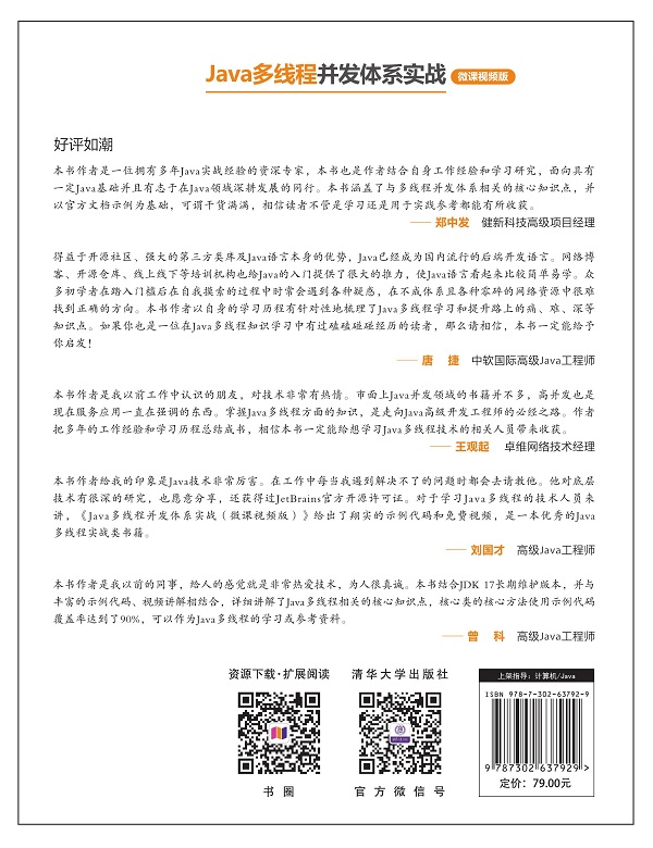 前言 2005年左右民用的多核CPU正式进入市场,标志着一个新时代来临了。双核和多核处理器设计用于在一枚处理器中集成两个或多个完整执行内核,以支持同时执行并管理多个任务。以前的单核CPU相当于一个人工作,它有很多任务,并很快地在任务之间切换工作,给人们造成的感觉好像是同时在执行,例如我上了一个聊天软件,我又在打游戏,感觉好像在同时执行,实际上单核CPU只是很快速地在各个任务之间切换工作,而多核心CPU相当于有多个人在同时工作,这才是真正意义上的多核心同时工作,当然它们也会在各个任务之间切换调度。 Java的多线程Thread核心类早在JDK 1.0就已经有了,从一开始就确立了Java最基础的线程模型,并且这样的线程模型在后续的修补中,并未发生实质上的变更,可以说是一个具有传承性的良好设计。 随着多核CPU的到来,在2004年发布的JDK 1.5中加入了Executors线程池、Callable、Future异步任务支持、Lock锁、concurrent并发包下的大量工具类,标志着Java多线程的时代来临了。 本书特点 本书以JDK 17长期维护版本为示例,详细地介绍了与Java多线程并发相关的知识体系,让读者不仅知其然,而且知其所以然。本书对多线程相关的理论分门别类、层层递进地进行详细叙述和透彻分析,既体现了各知识点之间的联系,又兼顾了其渐进性。本书在介绍每个知识点时都给出了该知识点的应用场景,同时配合代码演示,让读者更能明白其实现原理、使用方式。本书丰富的免费配套资源包括源代码、笔记、完整的配套视频。 本书主要内容 第...