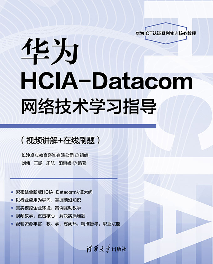 "本书系统地讲解了华为 HCIA-Datacom 网络技术的核心知识与实践技能,是备考华为 HCIA-Datacom认证(考试代码为 H12-811)的实用指南,全书从计算机网络基础、TCP/IP 协议等底层原理出发,逐步深入到华为通用路由平台、交换机配置等核心内容,全面解析虚拟局域网、生成树协议、IP 地址规划等关键技术,并详细阐述了静态路由和 OSPF 动态路由协议。书中还包含 VLAN 间通信、链路聚合等组网技术,以及访问控制列表、AAA 认证、网络地址转换、网络服务等安全策略,同时拓展了无线局域网、广域网、IPv6 等前沿领域,并兼顾网络管理运维与自动化编程的实践应用。本书采用“视频讲解+在线刷题”双模式教学,视频以可视化形式拆解复杂概念,在线题库精准匹配考点,助力读者高效掌握理论与实操要点。 本书既可以作为华为 ICT 学院的配套实验教材,用于增强学生的实际动手能力,也可以作为计算机网络相关专业的实验指导书,以及相关企业的培训教材。对于从事网络管理和运维的技术人员来说,本书是一本很实用的技术参考书。 版"