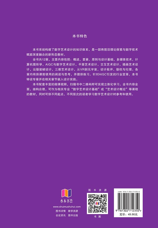 "本书全面介绍数字艺术设计的基础知识。全书共12章,主要内容包括: 概述,要素、原则与设计基础,多媒体技术,计算机图形学,AIGC与数字艺术设计,平面艺术设计,交互艺术设计,插画艺术设计,出版装帧设计,三维艺术设计,从VR到元宇宙,设计批评、版权与伦理。各章均有供课前使用的阅读与思考,并提供了练习,第5章和第8章中安排了利用AIGC开展的设计实践。 本书配套丰富的微课视频,扫描书中二维码即可实现立体化学习。全书理论知识全面,结构合理,可作为高等院校相关专业“数字艺术设计基础”或“艺术设计概论”等课程的教材,同时可供不同起点、不同层次的读者学习数字艺术设计时参考和使用。 "