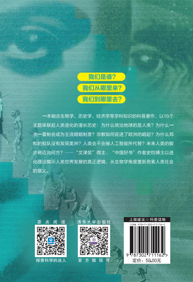 "一本融合生物学、历史学、经济学等学科知识的科普著作,以16个主题串联起人类进化的漫长历史:为什么统治地球的是人类?为什么一夫一妻制会成为主流婚姻制度?宗教如何促进了欧洲的崛起?为什么郑和的船队没有发现美洲?人类会不会被人工智能所代替?未来人类的脚步将迈向何方?……以进化理论揭示人类世界发展的真正逻辑,从生物学角度重新思索人类社会的意义。 "