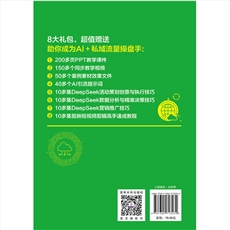 "本书是一本专为追求高效引流精准转化的运营者编写的AI引流手册。随书赠送了200多页PPT教学课件+150多个同步教学视频+50多个案例素材效果文件+40多个AI引流提示词,具体内容从以下三条线介绍。 第一条线是技巧线:本书深度剖析了AI引流的多样化技巧与转化策略,从热点引流到文案引流,从文案引流到图片引流,从视频引流到直播引流,从数字人引流到智能体引流,从社群引流到广告引流,为读者提供了一套具有吸引力的引流技巧体系。 第二条线是工具线:本书详细介绍了多种前沿的AI工具及其在引流中的应用,如DeepSeek、Kimi、即梦AI、可灵AI、腾讯智影、剪映、扣子等,帮助读者全面掌握AI工具。 第三条线是实操线:本书注重实践应用,精准展现27种典型的引流模式,通过大量的案例拆解展示AI引流的实践流程,帮助读者将理论知识转化为实际操作能力,从而快速掌握AI引流的实践技巧,构建属于自己的私域流量池。 本书内容丰富、实践性强,既适合作为创业者和中小企业主的引流实践手册,也是企业营销人员和自媒体人提升营销效果的有力工具,尤其适合希望借助AI技术提升引流效率的电商从业者和教育从业者,还可作为高校市场营销、电子商务、新媒体运营等相关专业的实践教材,全方位满足不同群体对AI引流的多元需求。"
