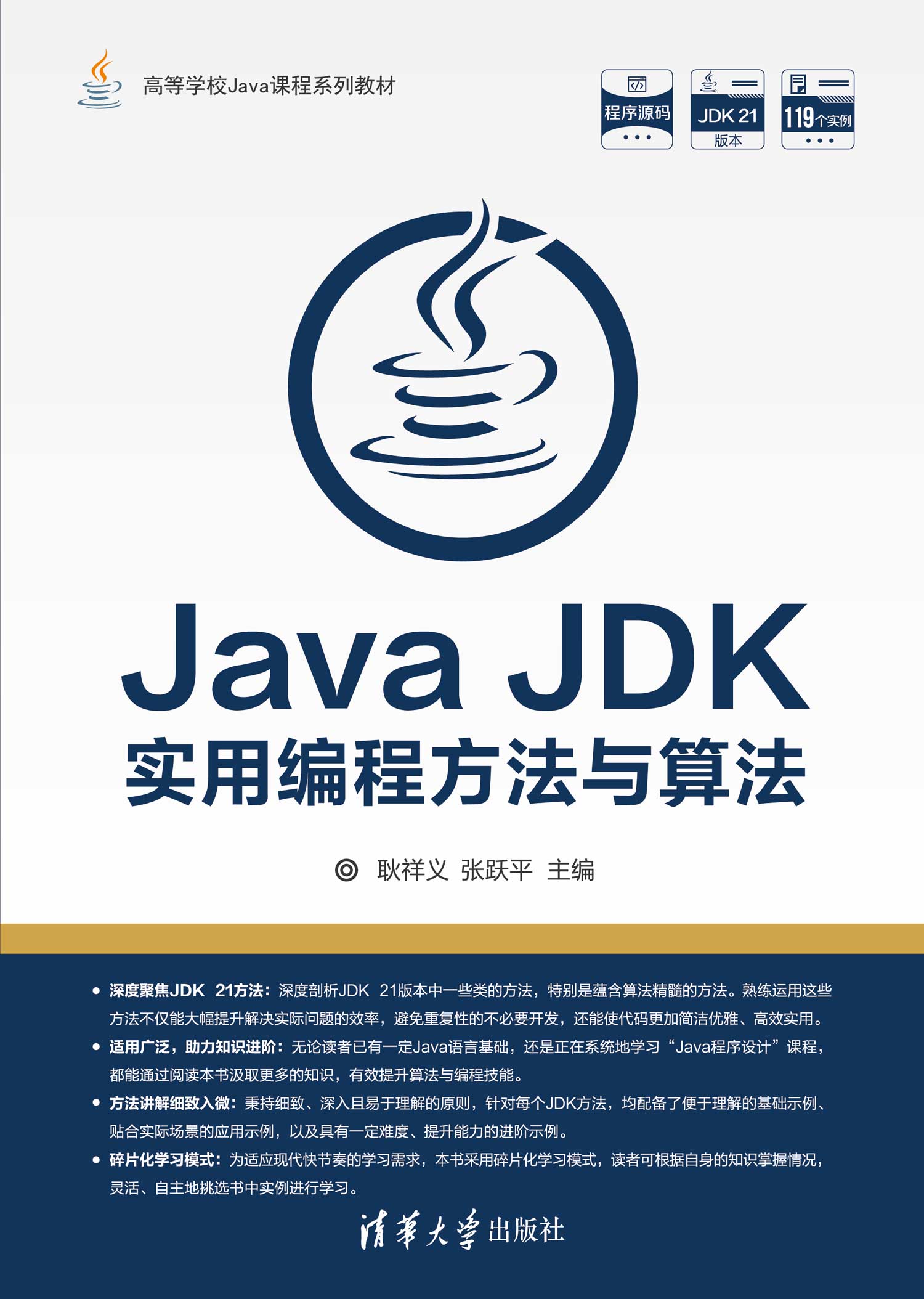 "本书基于JDK 21版本,借助119个精心设计的实例深入剖析JDK特定类的方法。本书紧密结合“Java程序设计”课程相关教材,如《Java 2实用教程(题库+微课视频版)》(第7版)和《Java面向对象程序设计》(第4版?微课视频版),对其内容进行全面补充与拓展。 全书共10章,按照JDK中包的层次精心组织内容。本书中的实例包含有助于理解重要知识点的基础示例、实际场景的应用示例、提升能力的进阶示例。全部实例在知识点方面覆盖了Java的基本语法、基础类、实用类、输入输出流、加密/解密、多线程、图形用户界面、图形图像、集合框架、Stream框架以及图论框架等内容。本书契合现代快节奏的学习需求,采用碎片化学习模式,读者可依据自身的知识掌握情况灵活、自主地挑选实例进行学习,真正实现个性化、高效的学习。 本书适合作为“Java程序设计”课程的教学参考书,特别适合作为《Java 2实用教程(题库+微课视频版)》(第7版)或《Java面向对象程序设计》(第4版?微课视频版)的配套参考书。 "