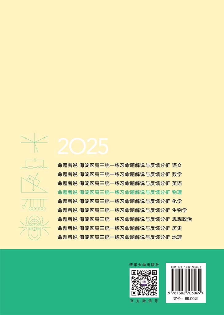 "本书由北京市海淀区教师进修学校物理教研室团队编写,系统解析2024-2025学年海淀区高三四次阶段性考试的命题思路与教学启示。全书以核心素养为主线,贯穿命题设计、试题解析、学情诊断和复习策略四大板块,涵盖以下命题理论框架、典型试题深度解析、学科发展趋势、区域教研成果转化等主要内容。首次公开海淀区“命题-测试-诊断-优化”的全流程教研经验,包括试题蓝图、情境素材筛选等技术细节。 核心特色:由原命题团队揭秘区域统考的设计逻辑,**附赠试题及参考答案,提供学科能力和素养测评框架的区域命题实践策略,具有较强的教学衔接的实操性。 读者对象:一是高中物理教师或高等院校中的物理学科准教师。教研组可用于集体备课,理解素养立意的命题技术,青年教师可通过命题案例,学习如何将教材内容转化为考查任务。二是高三学生和家长。高水平学生和家长重视教育改革和考试评价改革的动向,关注学科发展和试题素材的使用,通过阅读本书,理解区域命题对学生高阶思维训练搭建的脚手架和基本路径,有助于备考复习;基础薄弱学生可利用试题数据分析和教学改进建议,针对性补足自己的学科基础。三是教育研究者。教研同行可以参考海淀区命题和教学改进的试题案例解析,开展相关研究和教研;命题专家可以基于区域命题实践,分析“寓教于考”的成效,让区域备考复习和等级考学科命题良性互动。 出版价值:本书突破了传统教辅的“试题汇编”模式,开创了“命题研究-教学改进-学习优化”三位一体的内容生态。其价值在于,为教师提供“从考到教”的反向设计工具,实现“以评促教”,为学生建立“解题即解决问题”的认知范式,告别题海战术;为同行树立素养时代高考研究的标杆,推动评价改革实践。"